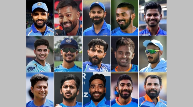 ರೋಹಿತ್ ಶರ್ಮಾ(ನಾಯಕ), ಹಾರ್ದಿಕ್ ಪಾಂಡ್ಯ(ಉಪ ನಾಯಕ), ಶುಭಮನ್ ಗಿಲ್, ವಿರಾಟ್ ಕೊಹ್ಲಿ, ಶ್ರೇಯಸ್ ಅಯ್ಯರ್, ಕೆ.ಎಲ್.ರಾಹುಲ್, ರವೀಂದ್ರ ಜಡೇಜ, ಶಾರ್ದೂಲ್ ಠಾಕೂರ್, ಜಸ್ಪ್ರೀತ್ ಬುಮ್ರಾ, ಮುಹಮ್ಮದ್ ಸಿರಾಜ್, ಮುಹಮ್ಮದ್ ಶಮಿ, ಕುಲದೀಪ್ ಯಾದವ್, ಅಕ್ಷರ್ ಪಟೇಲ್, ಇಶಾನ್ ಕಿಶನ್, ಸೂರ್ಯಕುಮಾರ್ ಯಾದವ್.