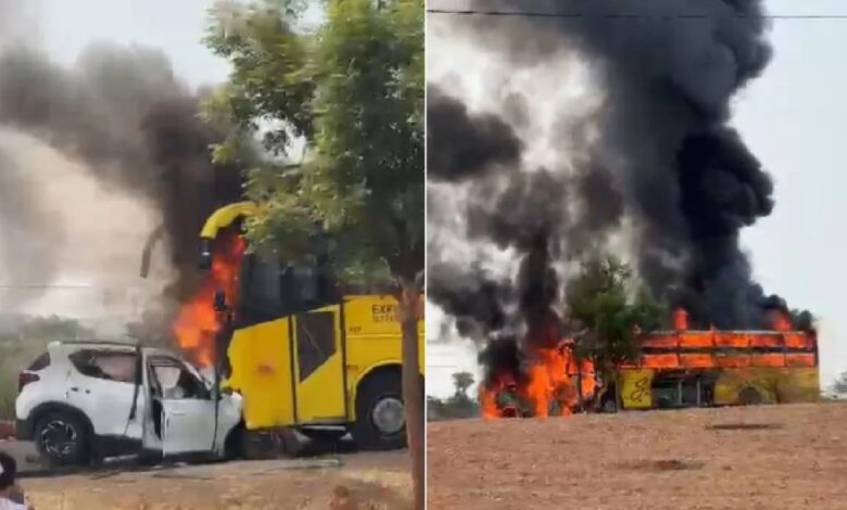 ಕಾರು-ಬಸ್ ಮುಖಾಮುಖಿ ಡಿಕ್ಕಿ:6 ಮಂದಿ ಸಜೀವ ದಹನ