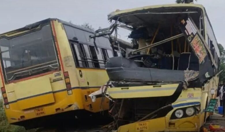 ಕನ್ನಡ ಕರಾವಳಿ ಸುದ್ದಿ: ತಿರುಪತ್ತೂರು ತಾಲ್ಲೂಕಿನ ನಾಚಿಯಾರ್ಪುರಂ ಬಳಿಯಲ್ಲಿ ರವಿವಾರ ಸಂಭವಿಸಿದ ಭೀಕರ ರಸ್ತೆ ಅಪಘಾತದಲ್ಲಿ ತಮಿಳುನಾಡು ರಾಜ್ಯ ಸಾರಿಗೆ ಸಂಸ್ಥೆಯ ಎರಡು ಬಸ್ಗಳು ಮುಖಾಮುಖಿಯಾಗಿ ಢಿಕ್ಕಿ ಹೊಡೆದು 11 ಮಂದಿ ಸಾವನ್ನಪ್ಪಿದ್ದಾರೆ. 50ಕ್ಕೂ ಹೆಚ್ಚು ಮಂದಿ ಗಾಯಗೊಂಡಿದ್ದು, ಹಲವರ ಸ್ಥಿತಿ ಚಿಂತಾಜನಕವಾಗಿದೆ.