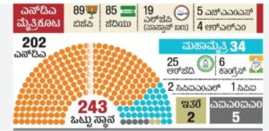 243 ಸಂಖ್ಯಾಬಲದ ಬಿಹಾರ ವಿಧಾನಸಭಾ ಚುನಾವಣೆಯಲ್ಲಿ ಎನ್ ಡಿಎ ಮೈತ್ರಿಕೂಟ 202, ಮಹಾಘಟಬಂಧನ್ 35, ಜೆ ಎಸ್ ಪಿ- 0, ಇತರೆ 6 ಸ್ಥಾನಗಳನ್ನು ಪಡೆದುಕೊಂಡಿವೆ.